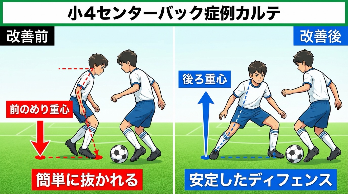 小4センターバックの「奪いに行くと簡単に抜かれる」と「インサイドが安定しない」を、重心と当て所の修正で改善した症例